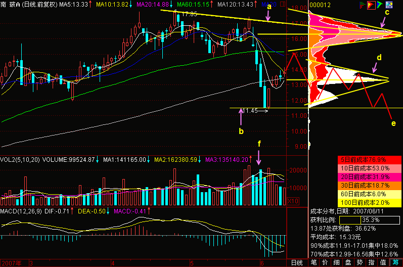 该股的走势到图上为止,与上面两个例子的股票基本相似。 首先该股在放量(图中f所指处)跌破120日均线后,股价反弹进入2&3区间,那么后市会如何演变呢?我们还是在上面先画出防踏空线a,如果股价要发动行情,必须得突破a线,但当我们把上面的筹码峰模拟出来后发现,筹码峰c是相当密集的,说明套牢筹码是很多的,股价想向上突破困难重重。 那么向下呢?如果股价要下跌的话,我们估计是先在下面的筹码峰d处运行,可能要构筑【120下小平台】,最后向下跌破小平台跳水,我们在这里没有找到合适的低点连线可供使用,那就用股价跌至2-3区间时候那个最低收盘价做一条水平线b,如果股价向下跌破这根b线,那么就要跳水了,而我们推测股价向下突破的可能性要大于向上突破的可能性,股价很可能朝图中的e线方向向下突破。