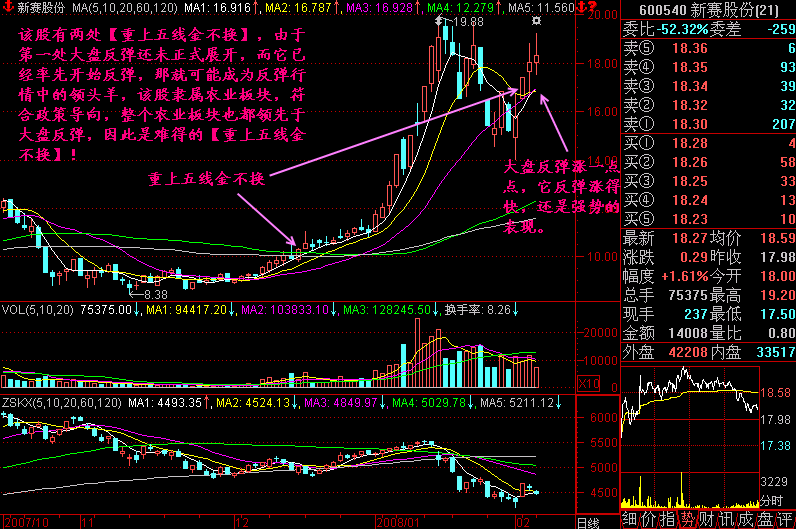 图242-5 小结: 在一只股票上涨的过程中,总会出现下跌段,它不可能一直处于五线之上,而一只股票能够上涨的部分,却又都是在五线之上(超跌反弹或者逢低买进不是俱乐部技术),所以对于我们来说,当股价下跌完毕,判断庄家没有出局,且股价重上五线的时候,就是一个很好的买入点位,我们称这个买入法为【重上五线金不换】!当然这还要结合大盘情况,个股能量强弱情况、甚至基本面等综合研判,但在股价形态上,我们就是这么把握的,这样可以使得我们的操作变得比较简单有效!大道至简!好的招数往往很简单,【重上五线金不换】就是这样的! |