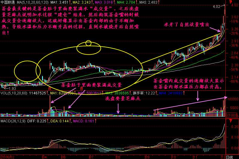 图276-4 小结: 【茶壶】是广通经典形态之一,是一个合成技术,它综合了放量建仓,缩量洗盘,斜面推高,量犄角,放量喷出等等单一技术,它形象的描述了庄家建仓、洗盘、突破拉高的过程。 【茶壶】最关键的一点是肚子里面要装满成交量,在条件允许的情况下,应该要查看该股的灵稳榜数据,以确保这些成交量里面是主动性买入量居多,那么配合上洗盘量芝麻点,斜面推高,最后放量喷出,就是一个完整的【茶壶】形态了。 |