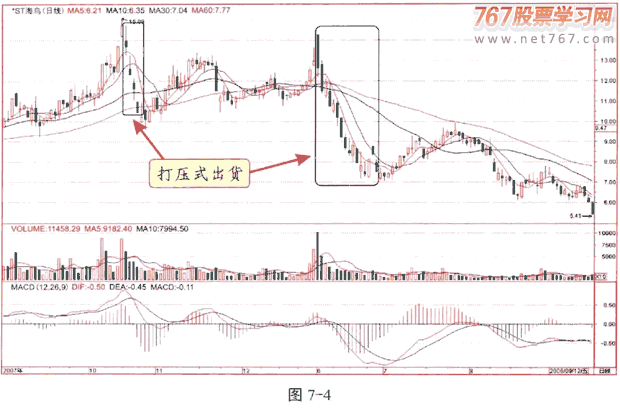 四、打压式出货 打压式出货的出现往往是因为庄家发现了突发性的利空,或者某些因素迫使庄家要迅速撤庄。由于庄家的持股成本要远远低于一般投资者,即使打压出货也可以获取丰厚的利润。 这种出货手法凶狠且杀伤力极大,一般庄家在持筹不多或获利颇丰的情况下善用此法。刚开始打压时,庄家会让散户误认为这只是暂时的回调洗盘而已,后市还会继续上涨,打压两三天后,当市场对放出的大成交量有所警觉时,庄家会更加凶狠的打压股价,令前几日买入者通通套牢。但此法由于派发时间短,下跌迅速,大部分庄家无法全身而退,只能利用后市大市回暖之际拉高自救,完成最后的出货任务,如图7-4所示。