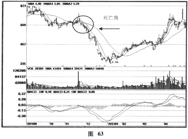 金叉上涨、死叉下跌已成为股市操作的通理,庄家正是利用散户铭记于心的理念进行做盘。股价见顶回落一定幅度后,出现短暂的反弹行情,由于庄家出货坚决,反弹结束后股价再次步人跌势。随后,5日均线向下死叉10日均线后,再次死叉30日均线,10日均线下行。不几日,10日均线向下死叉30日均线,30日均线下行,在图形上出现一个尖头向下的死亡角。死亡角一旦形成颇具杀伤力,因此死叉后股价比此前跌得更凶,成交量也有明显的放大。 庄家坐庄意图:利用技术指标做盘,造成恐慌盘面,加强杀伤力。 散户克庄方法:套牢不深的散户,可以在死亡角图形出现时卖出。持币者可以在出现止跌信号时,少量介入抢反弹。 图63,上海科技(600608):该股走势中,股价反弹结束后,5日均线向下死叉10日均线后,再次死叉30日均线,10日均线下行。随后10日均线也向下死叉30日均线,30日均线下行,形成的一个“死亡角”,此后出现“瀑布式”的砸盘过程,股价跌幅较大。