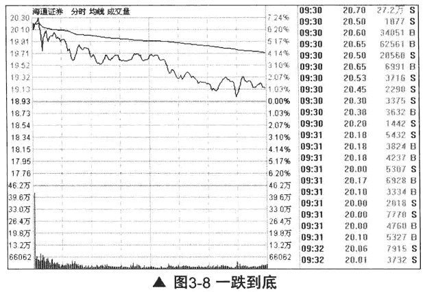 高开低走包括了如下两种形态:反手拉高和一跌到底。下面就分别对两者进行讲解。 1.反手拉高 通常在高开后快速杀跌,并且卖盘很大,但是时间短,短到股民根本没时间来得及卖出股票就跌去了三四毛钱,随后又快速拉高。此时可以看到交易线跌破了均线,但是均线并没有向下弯曲,并在快速拉高后突破先前高点。如果出现该走势全天收阳概率在80%以上。 如图3-7所示为泸州老窖的分时图,从中可以看到在开盘时走出了反手拉高的走势。 面对该走势,在实盘中需要进行如下思考: 第一、如果此股当日涨停,那么次日再次上涨概率在80%以上,可以积极参加。 第二、如果该股没有涨停,那么次日上涨概率在70%以上,可以积极参加。 2.一跌到底 在开盘后,遇到大量卖盘,回调时买盘很少,随后一路下跌,并快速跌破均线,每次反弹在均线附近腰折。当出现这种开盘走势后,就该尽量回避,收跌概率在80%。 如图3-8所示为海通证券分时走势图,该走势图显示了一跌到底的走势。 |